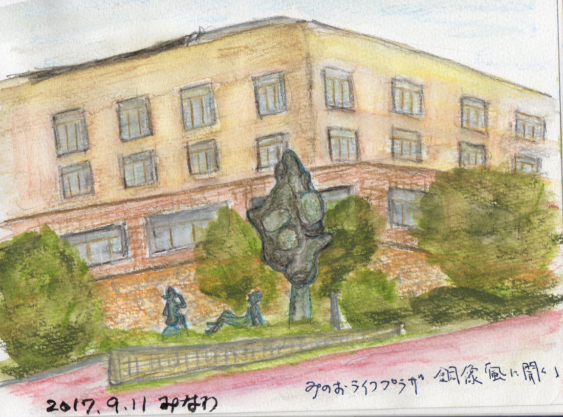 2017.3.15 雨もよいの午後、近くの箕面市東図書館二階に行き、描きました。