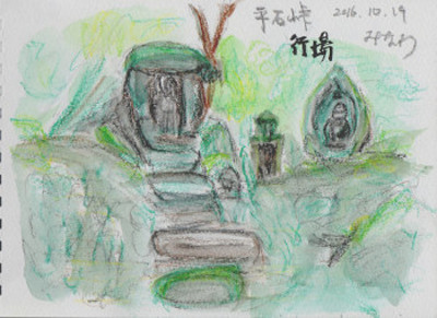 林道から山道へと分け入る。少々登りはきつい。50分ほどで藪の濃い道を登り切ると、平石峠に立った。ここは二上山からのダイヤモンドトレイルと交差するジャンクションだった。⒑:⒛、まだ昼食には早い。峠の脇上に「役行者石仏《がある。2体の石仏がある。山奥に人知れず安座する石仏とまわりの備えには、なるほど行者にふさわしい謹厳とそして幽遠がただよっている。スケッチする。