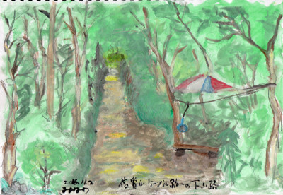 里への下山は、ケーブル跡ハイキング道をたどります。まるで定規で引いたような一直線の山道です。まっすぐ見通すことのできる緑の回廊です。